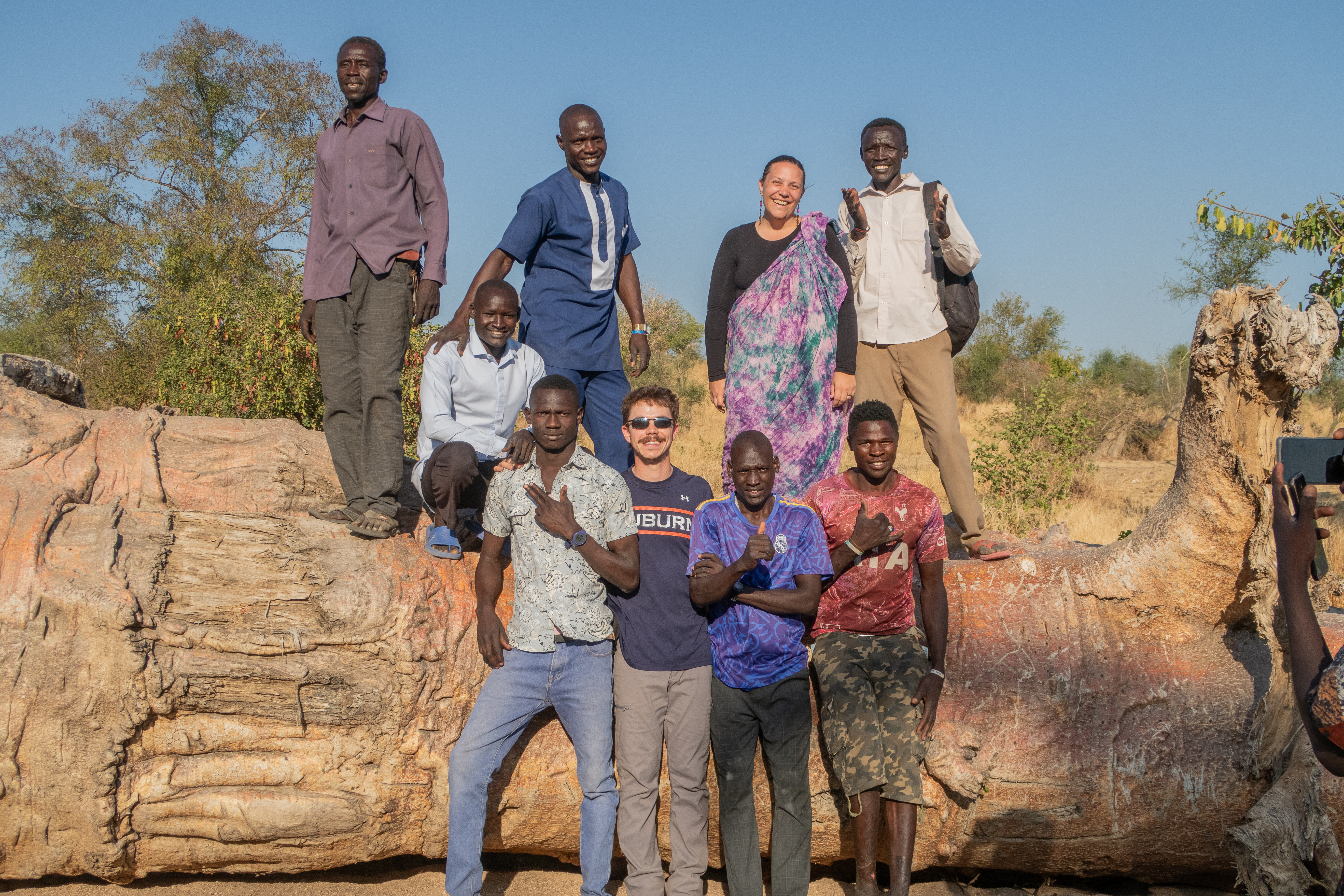 It was with pride that I managed almost as well as a Sudanese woman would in her own dress, and only caught my layers once on some fallen acacia thorns. In the dry riverbed valley below the brow of the hill, we see a baobab trunk that was swept down in last season’s flood. I still haven’t gotten over my giddy excitement of seeing these massive, distinctive-looking trees for the first time in my life in this area, so I rush down to feel its smooth, cool bark and branches I could never reach in standing trees. The youngest guys clamber up the side of the massive fallen trunk, and I know instantly I can’t miss this opportunity. With a moment to assess the physics involved, I kick off my flip flops and flex my toes in the sandy pea gravel underneath my feet. I hike up my layers and to accompanying shouts of “Go slow!” and “Don’t let the white woman fall!” I hop up the side of the ancient tree, using gnarled knots in the bark for hand and foot holds, with my skirts gathered in one hand. Everyone nearby swarms back up the tree and poses for a picture with the white girl in the local dress who miraculously avoided face-planting.